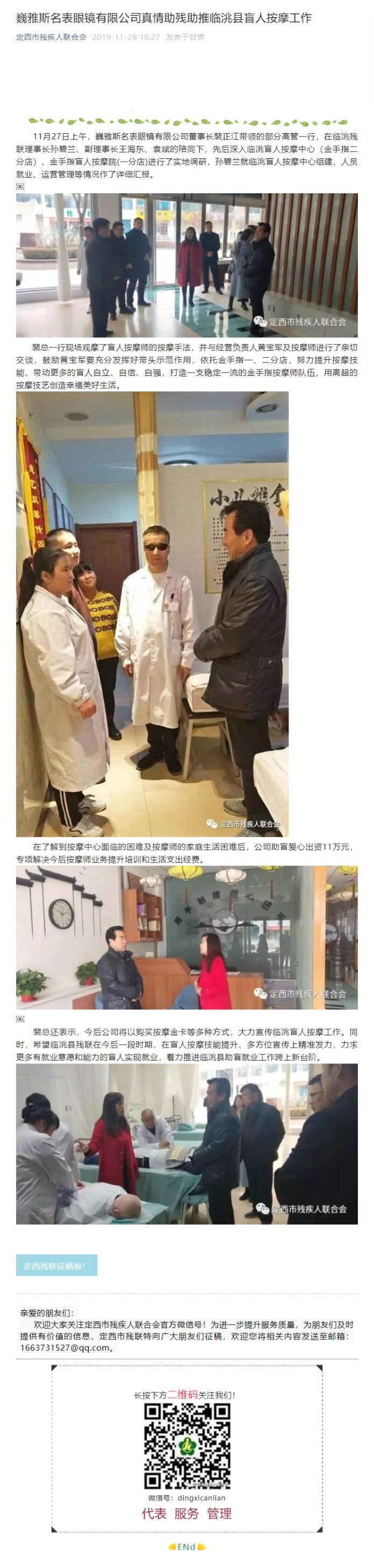 巍雅斯名表眼鏡有限公司真情助殘助推臨洮縣盲人按摩工作