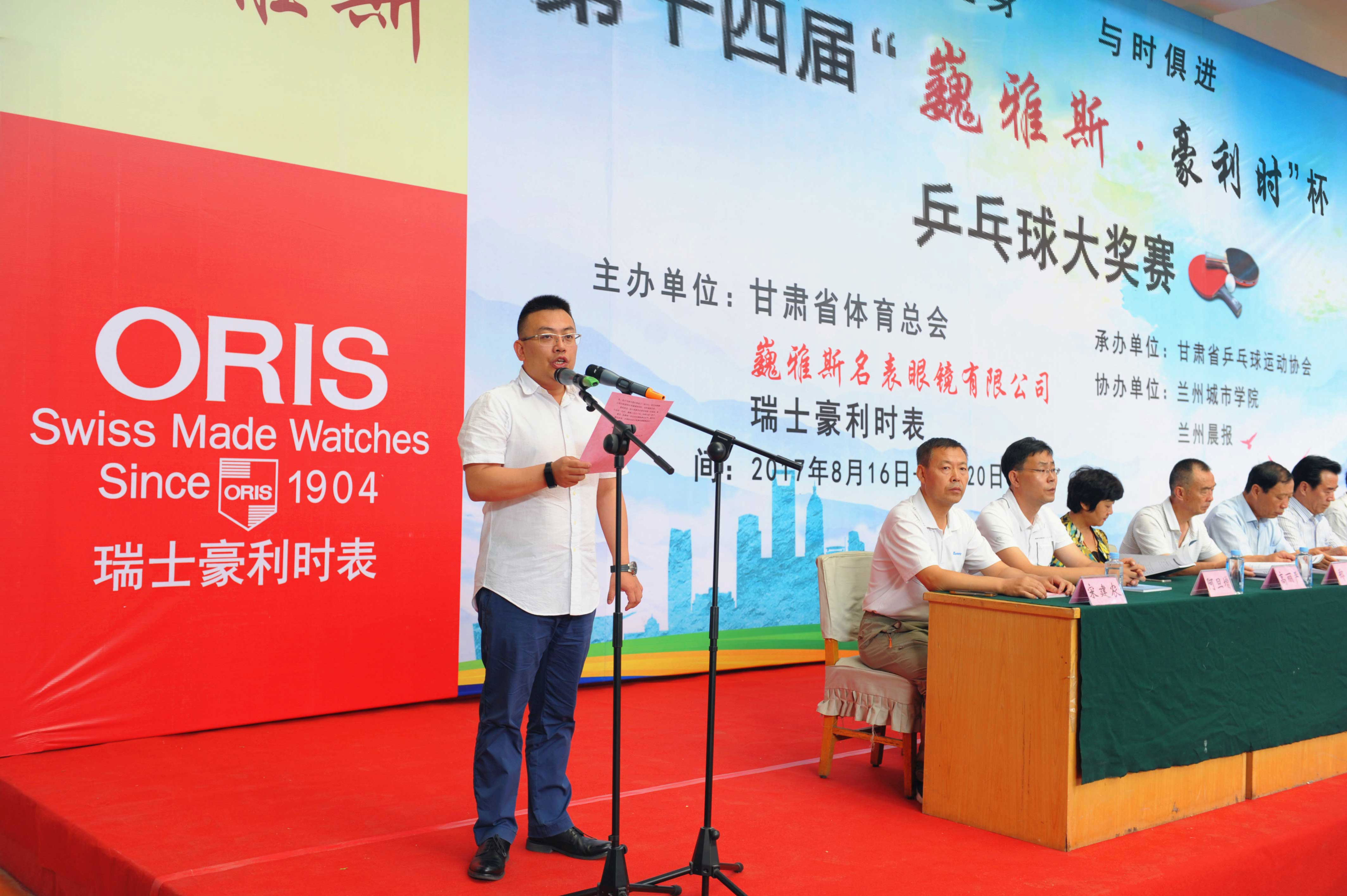 中國商業(yè)聯(lián)合會鐘表商分會副會長、甘肅省眼鏡協(xié)會會長、甘肅省乒乓球協(xié)會副會長、巍雅斯名表眼鏡有限公司董事長裴正江,瑞士豪利時表中國區(qū)總經(jīng)理嚴明輝先生及有關領導、運動員、裁判員、教練員、工作人員一千兩百多人參加了簡樸但氣氛熱烈的大獎賽開幕式。