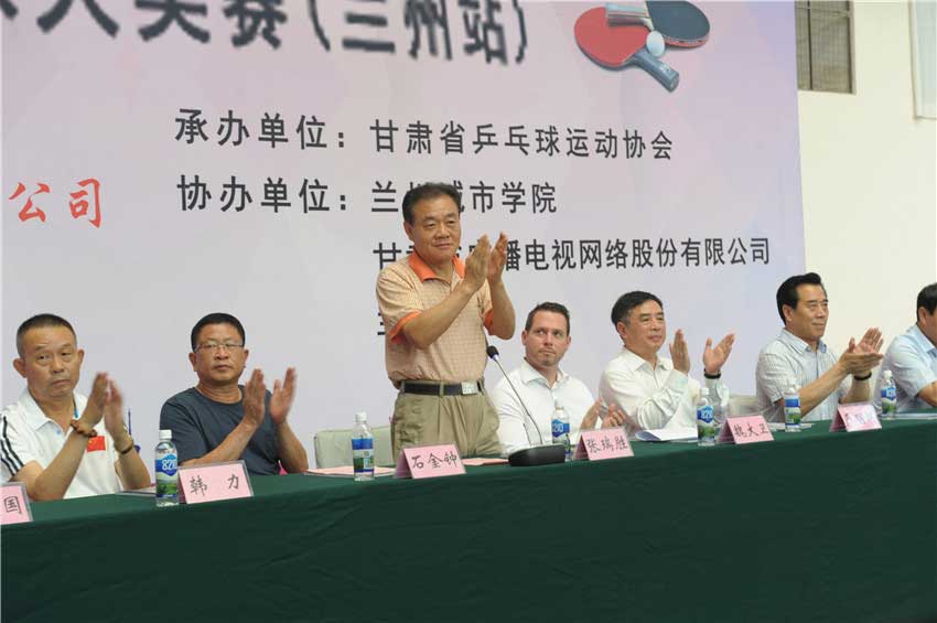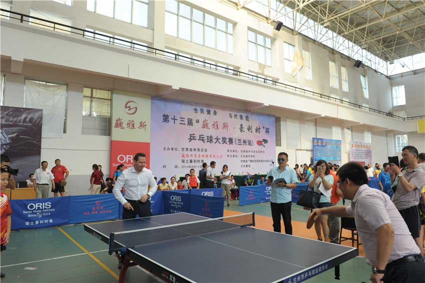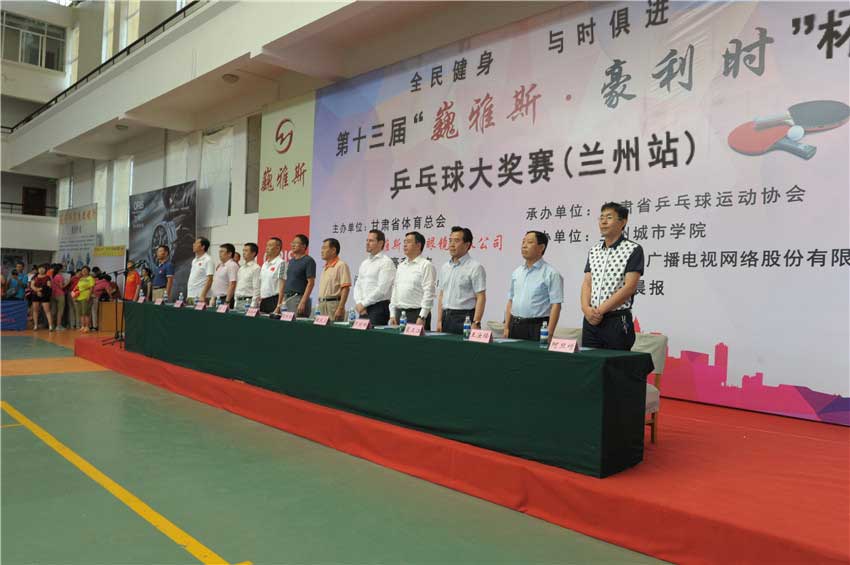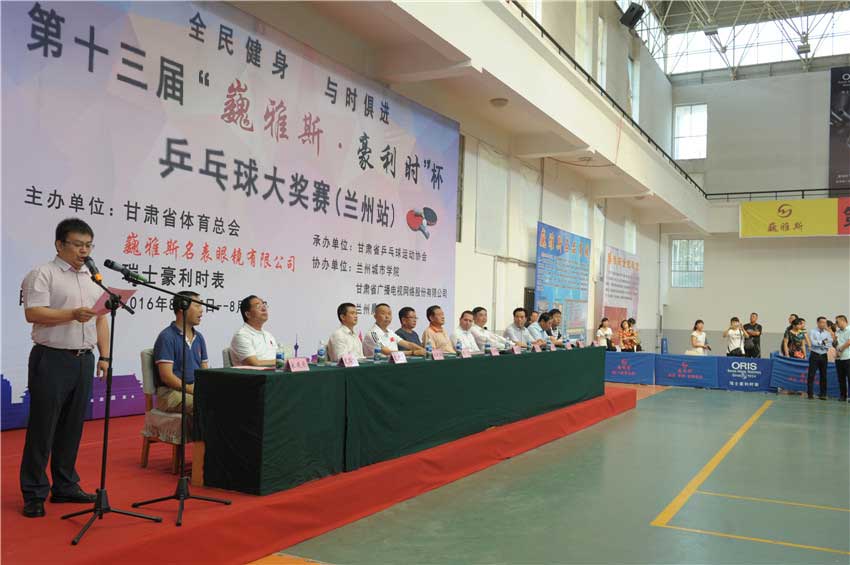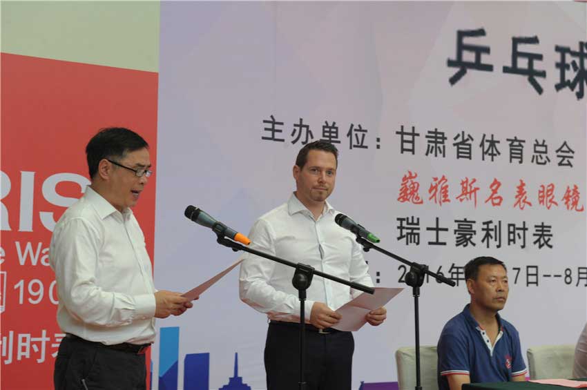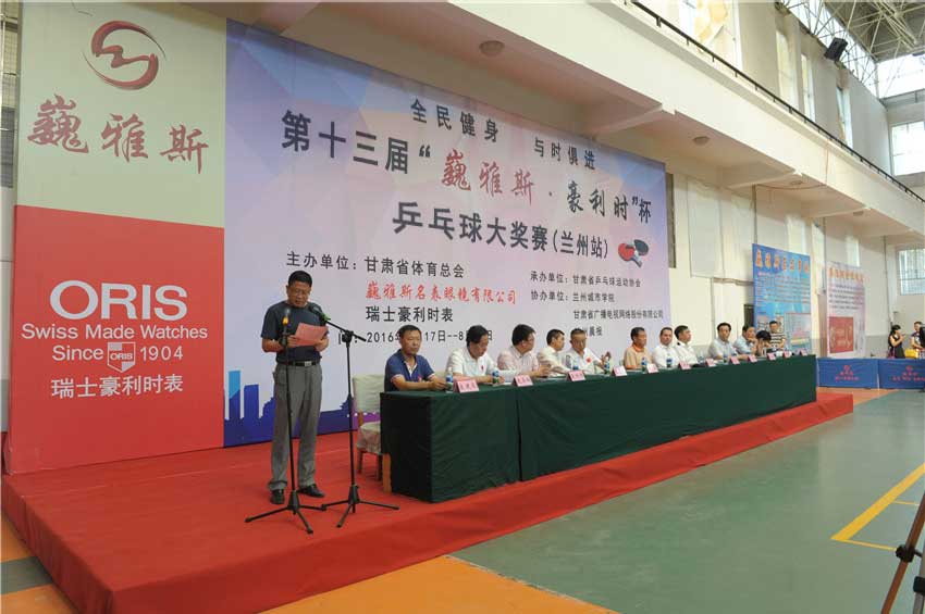 原蘭州軍區(qū)空軍副司令員張瑞勝、中國鐘表商會副會長、甘肅省眼鏡協(xié)會會長、甘肅省乒乓球運(yùn)動協(xié)會副會長、巍雅斯名表眼鏡有限公司董事長裴正江、巍雅斯名表眼鏡有限公司總裁裴明偉、瑞士豪利時(shí)表大中華區(qū)總裁David Weber先生、甘肅省體育總會秘書長石金鐘、瑞士豪利時(shí)表中國區(qū)總經(jīng)理嚴(yán)明輝、甘肅省乒乓球運(yùn)動協(xié)會會長韓力、甘肅省乒乓球運(yùn)動協(xié)會秘書長宋建農(nóng)及相關(guān)領(lǐng)導(dǎo)等社會各界人士、運(yùn)動員、裁判員、工作人員約一千兩百余人參加了簡樸但氣氛熱烈的大獎(jiǎng)賽開幕式。