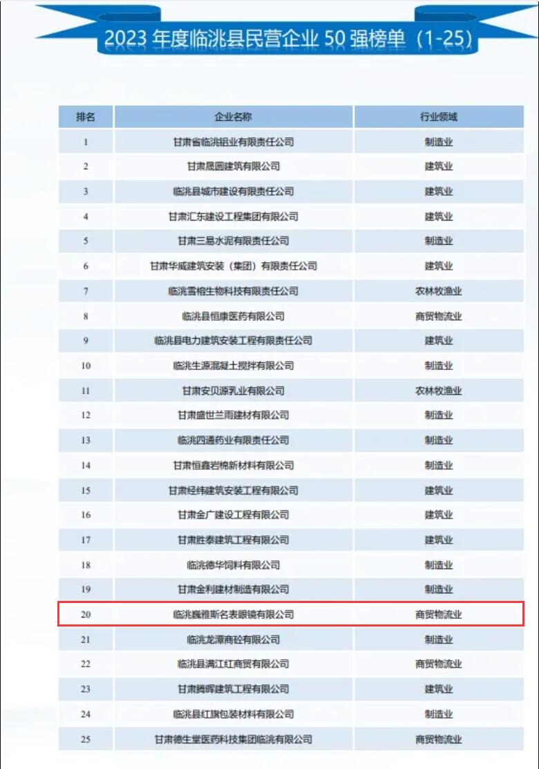 臨洮公司入列2023年度臨洮縣民營企業(yè)50強及行業(yè)10強榜單